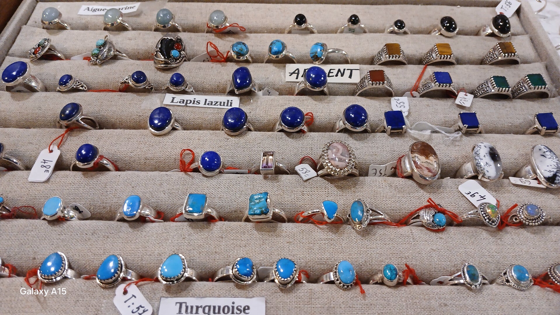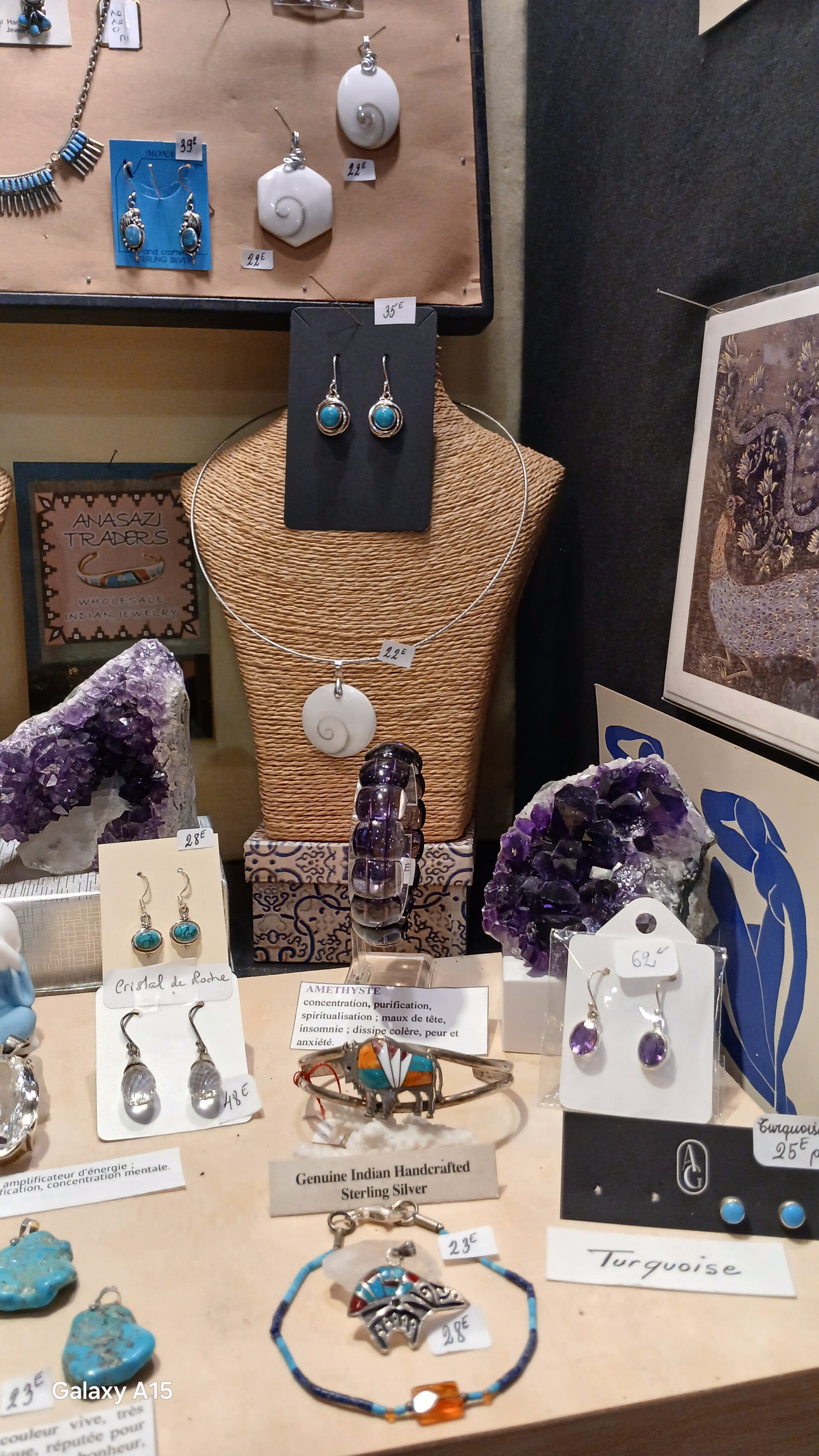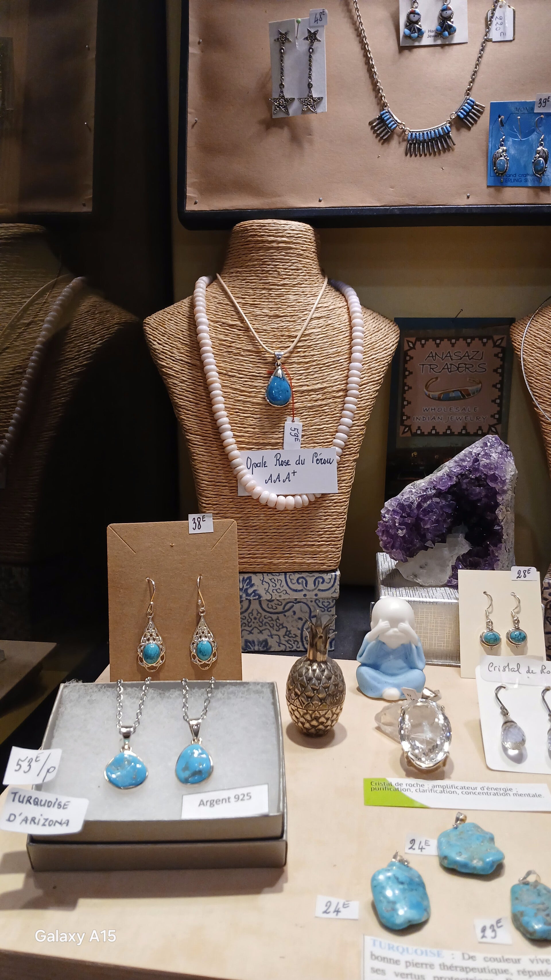 Dans cette vitrine, la turquoise déploie son bleu protecteur, vibrant comme un souffle d’air pur.