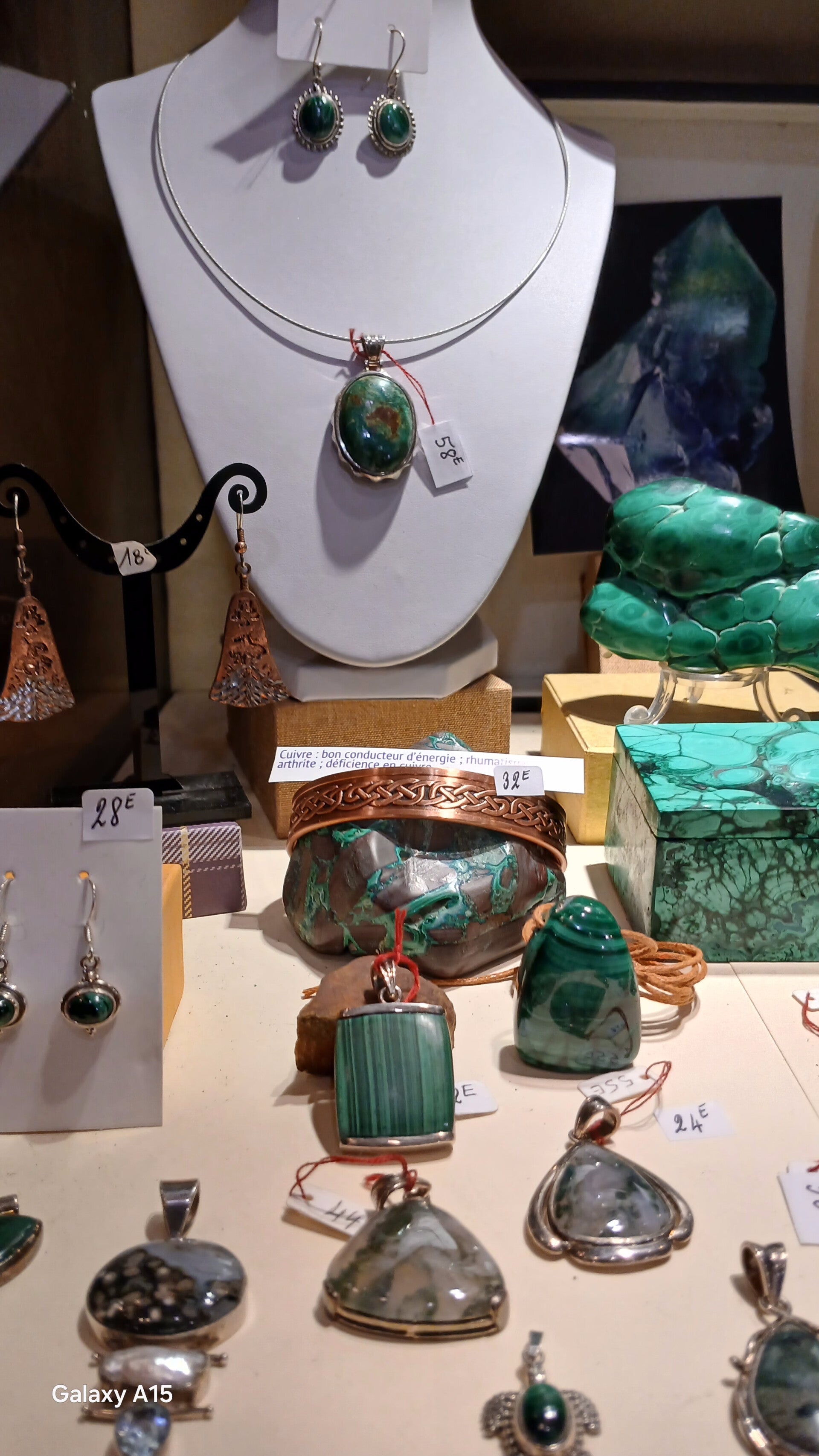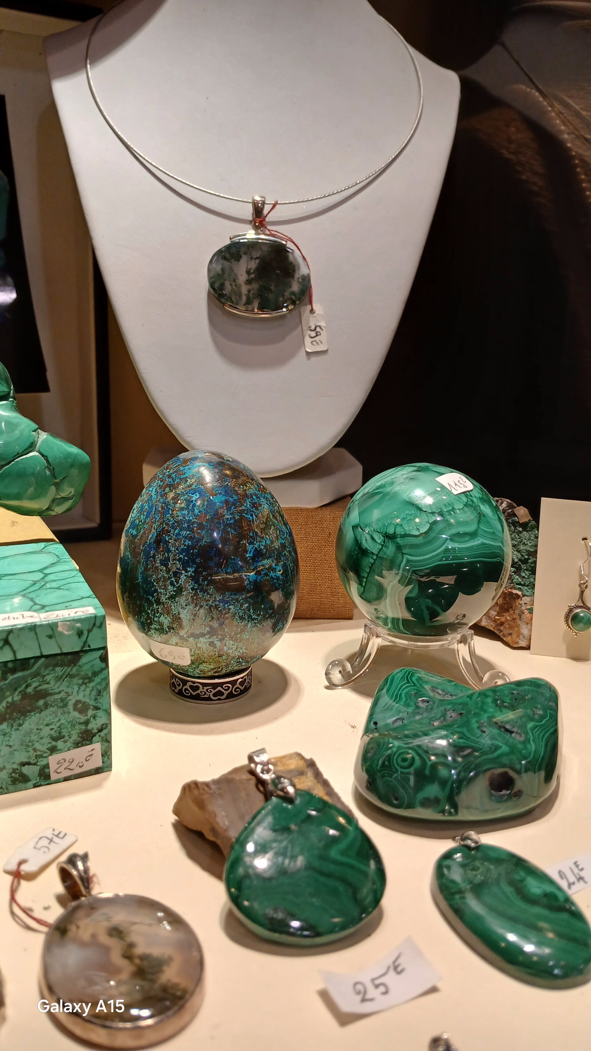 Malachite, Chrysocolle, Agate mousse, Jade Néphrite, Séraphinite, Héliotrope, Quartz Solaire